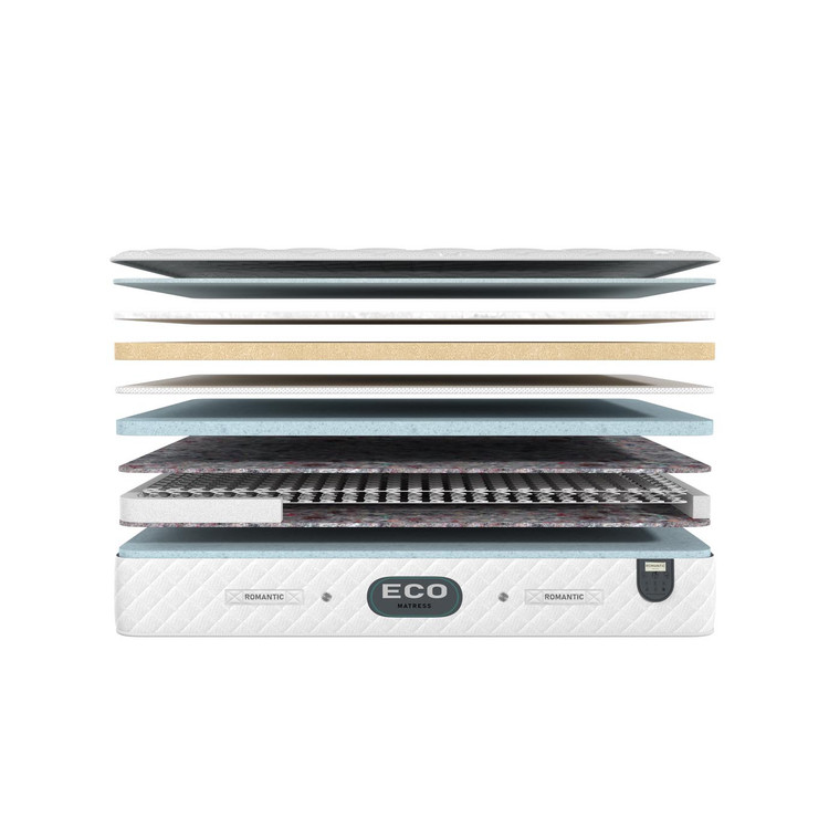 تشک اکو از سری تشک های فنر متصل و دو طرف یکسان می باشد . فنر به کار رفته از نوع فنر میکرو بونل(دارای تعداد فنر بیشتر نسبت به فنر های مشابه) با مفتول منحصر به فرد است که با یک لایه ضخیم و با کیفیت اسفنجی دور تا دور اسکلت تقویت شده است که باعث افزایش طول عمر دیواره های تشک می شود . رویه اسکلت فنر این تشک یک لایه نمدی فشرده با گرماژ بالا به کار رفته که باعث می شود وزن بدن در سطح تشک تقسیم شود در همین راستا شما فنر ها را کمتر حس می کنید. بعد از لایه نمدی یک لایه اسفنجی با دانسیته بالا به کار رفته که راحتی شما را تضمین می کند. تشک اکو از دسته تشک های فنری و نسبتا سفت به حساب می آید . از دیگر لایه های تشک اکو میتوان به لایه اسفنجی جهت سهولت بیشتر ، لایه الیافی ترموفیوز جهت گردش هوای سطح تشک و پارچه پلی کتان سه لایه ضد تعریق، لطیف، آنتی باکتریال و ضد حساسیت اشاره کرد.